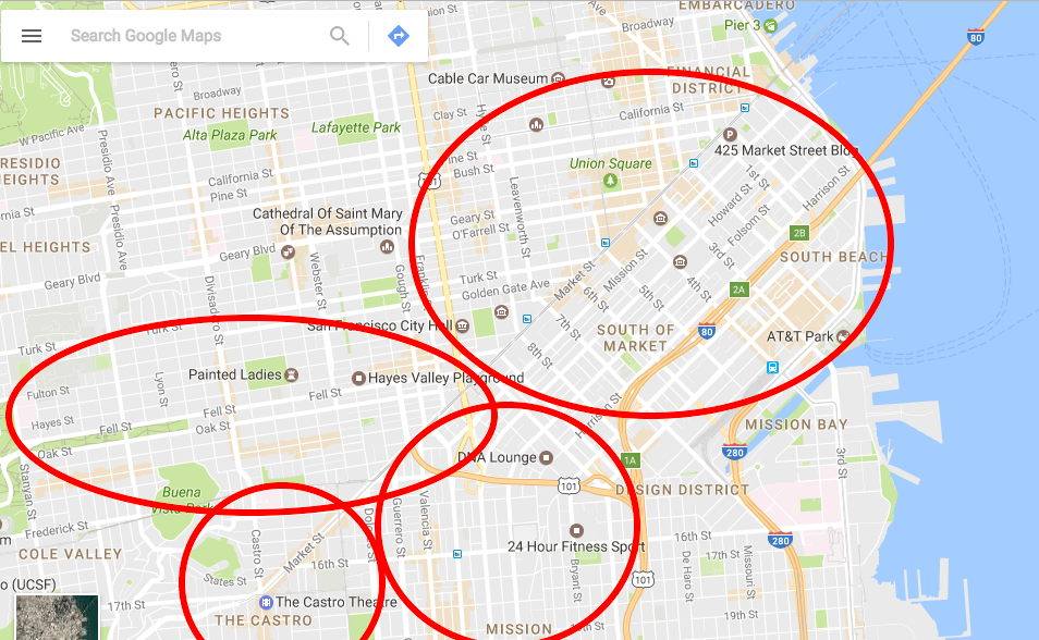 Castro, Lower and Upper Haight, Nopa, Pacific Heights, Mission District, Duboce Triangle, Soma, Mission Bay, and greater downtown area.